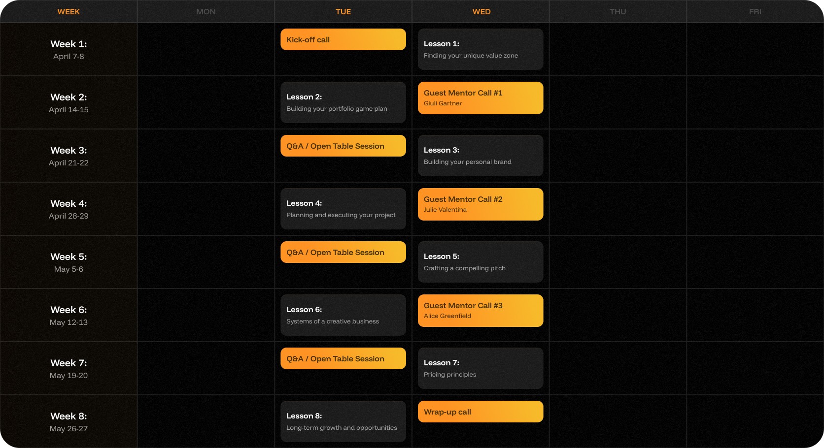 Expert-led calls covering branding, storytelling, content creation, marketing, pitching, pricing, and scaling